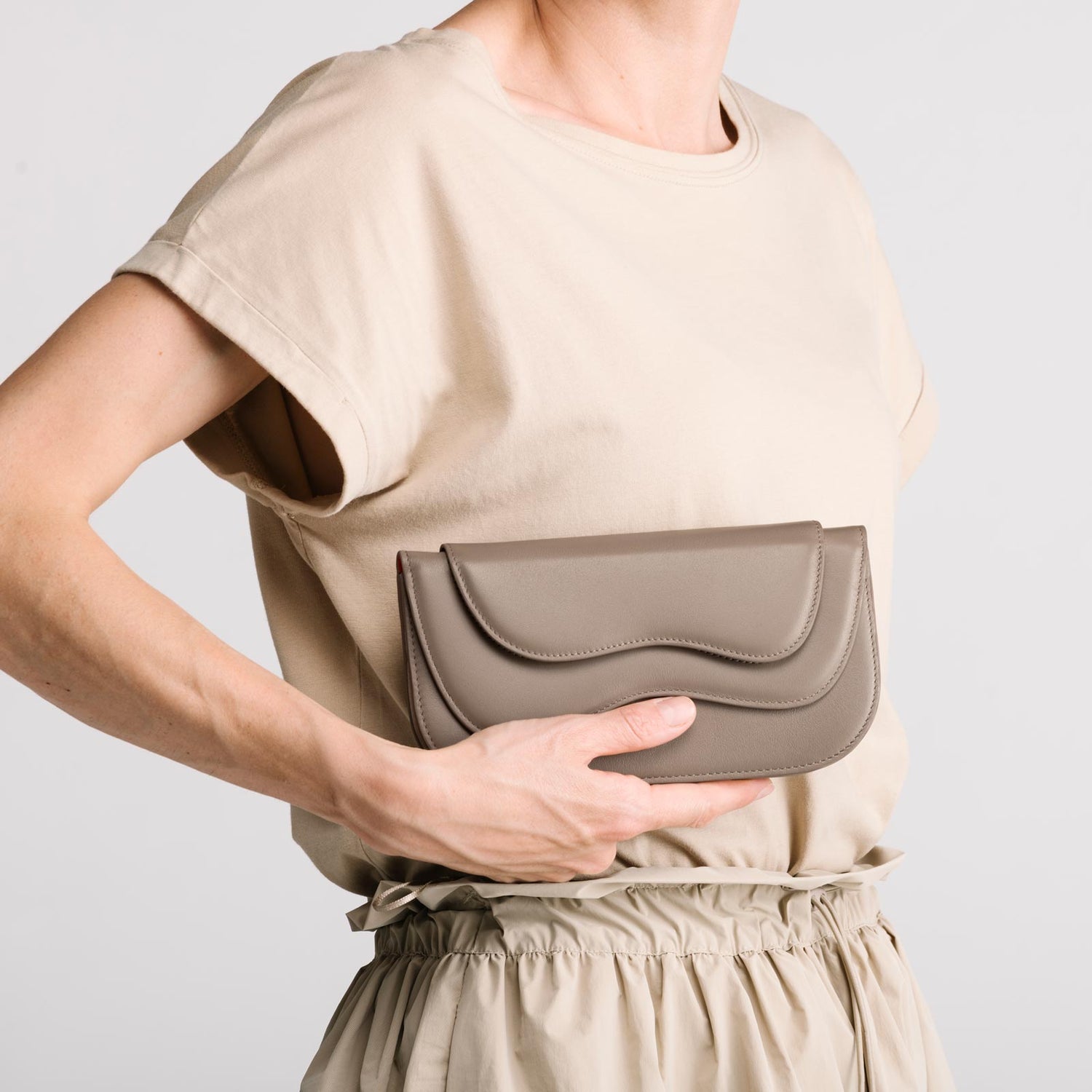 The Wave Wallet, a wallet-turned-shoulder-bag. The Wave Wallet features two conjoined leather flaps that open to reveal space for all your financial essentials. A leather divider creates two compartments, with one side for notes and cards, and the other large enough to fit the iPhone Max, and your passport. Spacious enough to hold more than your usual coin purse, yet compact enough for you to locate your metro card lickity-split, Wave Wallet is as utilitarian as it is covetable.
